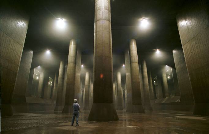 日本人以其先進、足以自誇於世界的土木工程技術在埼玉縣(Saitama)搞了一座宛如奇幻電影場景的暴雨排水系統,以防止颱風季節因為暴雨而可能出現的洪氾,守衛日本大東京地區,避免受到水災侵襲。
